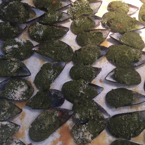 Coprite ogni cozza con un pò di questo composto, cospargete sopra alle cozze una spolverata di pangrattato e un filo d’olio d’oliva.