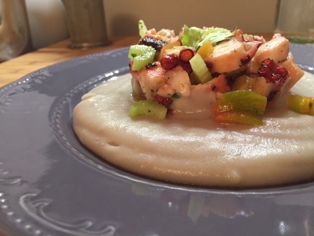 Questa ricetta è una rivisitazione del solito polipo e patate, visto e rivisto ma sempre un ottimo abbinamento e ho pensato quindi di renderlo un pò più moderno e fresco creando un tortino di polipo, sedano e pomodoro su crema di patate.