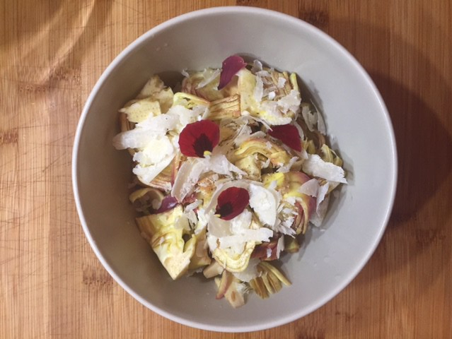 Scolate i cuori di carciofo dall’acqua e limone, asciugateli e tagliateli a fettine sottilissime, mettetele in una ciotola e conditele con la vingrette precedentemente preparata. Rimescolate e aggiungete alla vostra insalata di carciofi le scaglie di parmigino reggiano e qualche petalo di fiore edulo per decorare il piatto.