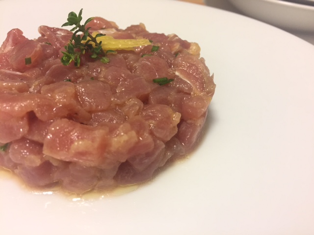 Lasciate riposare il tonno nel succo per circa venti minuti, dopodichè con l’aiuto di un colino a maglie strette scolate il succo e impiattate le vostre tartare di tonno con l’aiuto di un coppapasta. Guarnite con qualche pezzetto di scorza di limone e qualche fogliolina di timo o erba cipollina.
