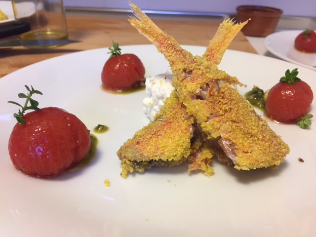 Pulite le triglie dalle interiora e toglietegli la testa (se chiederete al vostro pescivendolo di fiducia potrà farlo per voi). Ungetele con un filo d’olio EVO e impanatele passandole nella farina di mais (potete utilizzare anche quella normale ma quella di mais darà un tocco più croccante). In una padellina antiaderente scaldate un dito di olio di semi di girasole e friggete le triglie per circa 3 minuti per ogni lato facendo molta attenzione quando le girate perchè sono delicatissime.