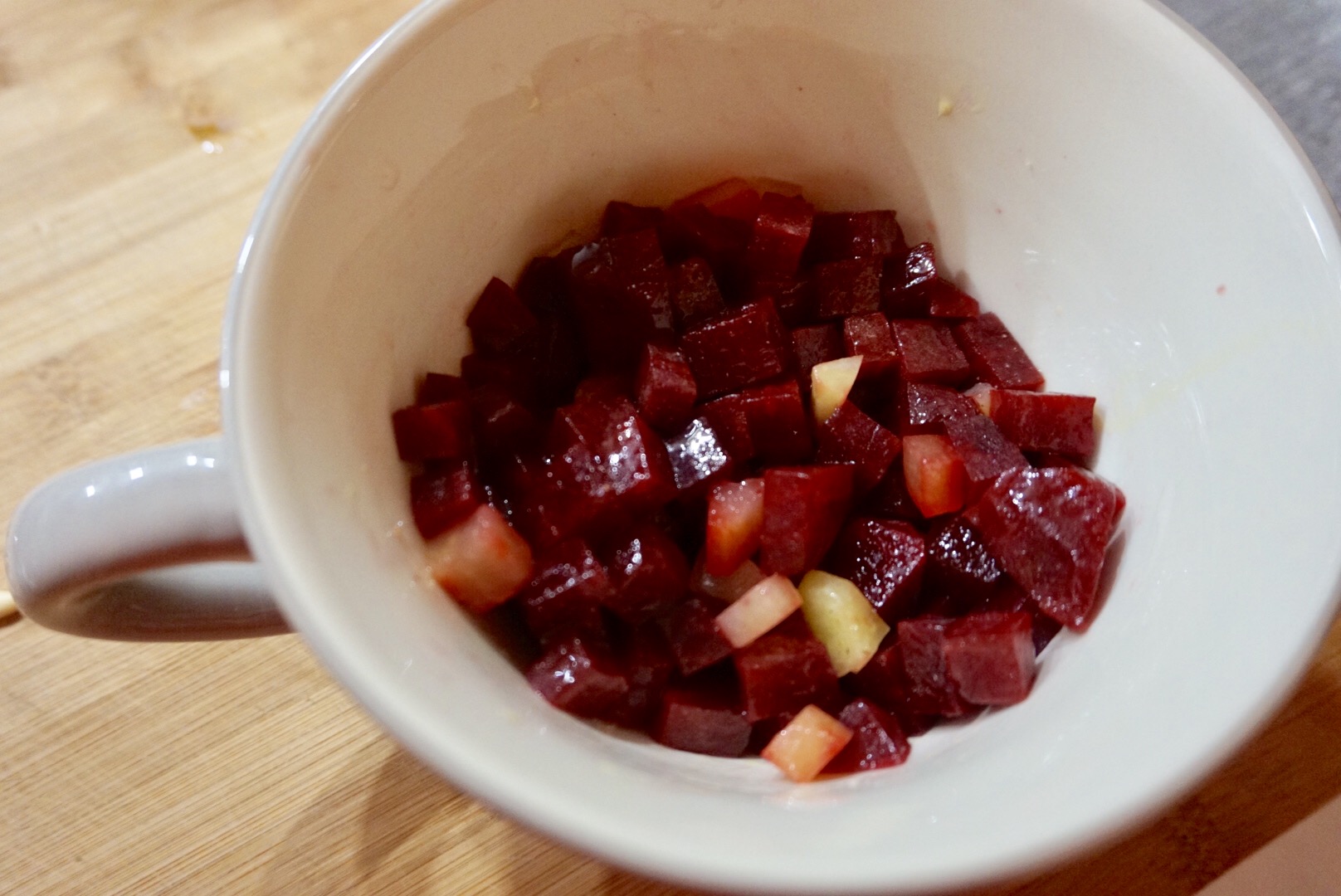 Dadolata di barbabietola e patata croccante con yogurt greco, anelli di cipolla, pinoli tostati e foglie di pane carasau