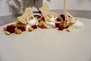 Dadolata di barbabietola e patata croccante con yogurt greco, anelli di cipolla, pinoli tostati e foglie di pane carasau