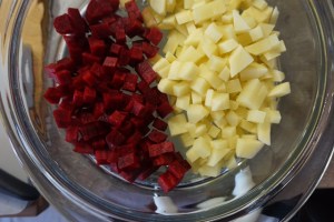 Dadolata di barbabietola e patata croccante con yogurt greco, anelli di cipolla, pinoli tostati e foglie di pane carasau