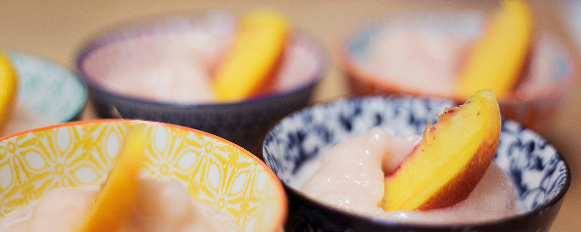 Frullate le pesche, l’acqua e lo zucchero (precedentemente unito all’amido di mais) e versate il composto nella gelatiera per 30 minuti.