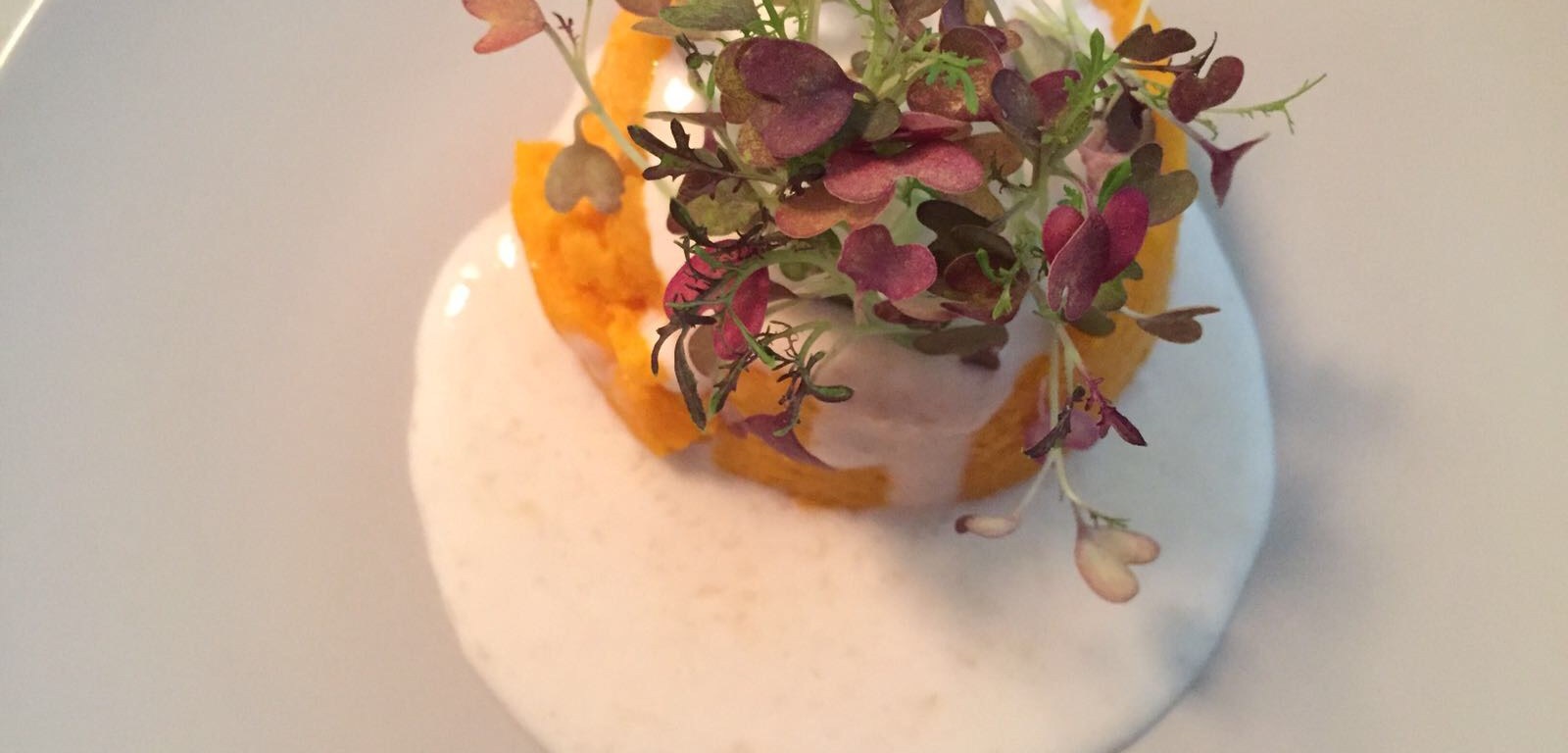 Quando anche i vostri tortini di zucca saranno cotti, lasciateli intiepidire e sformateli sul piatto dove avrete già steso la vostra fonduta di formaggio e guarnite con germogli di Mizuna (senape giapponese).