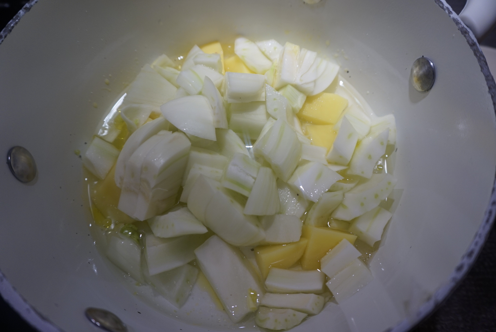 Cubotti di zucca al gorgonzola e mandorle su crema di finocchio e patata