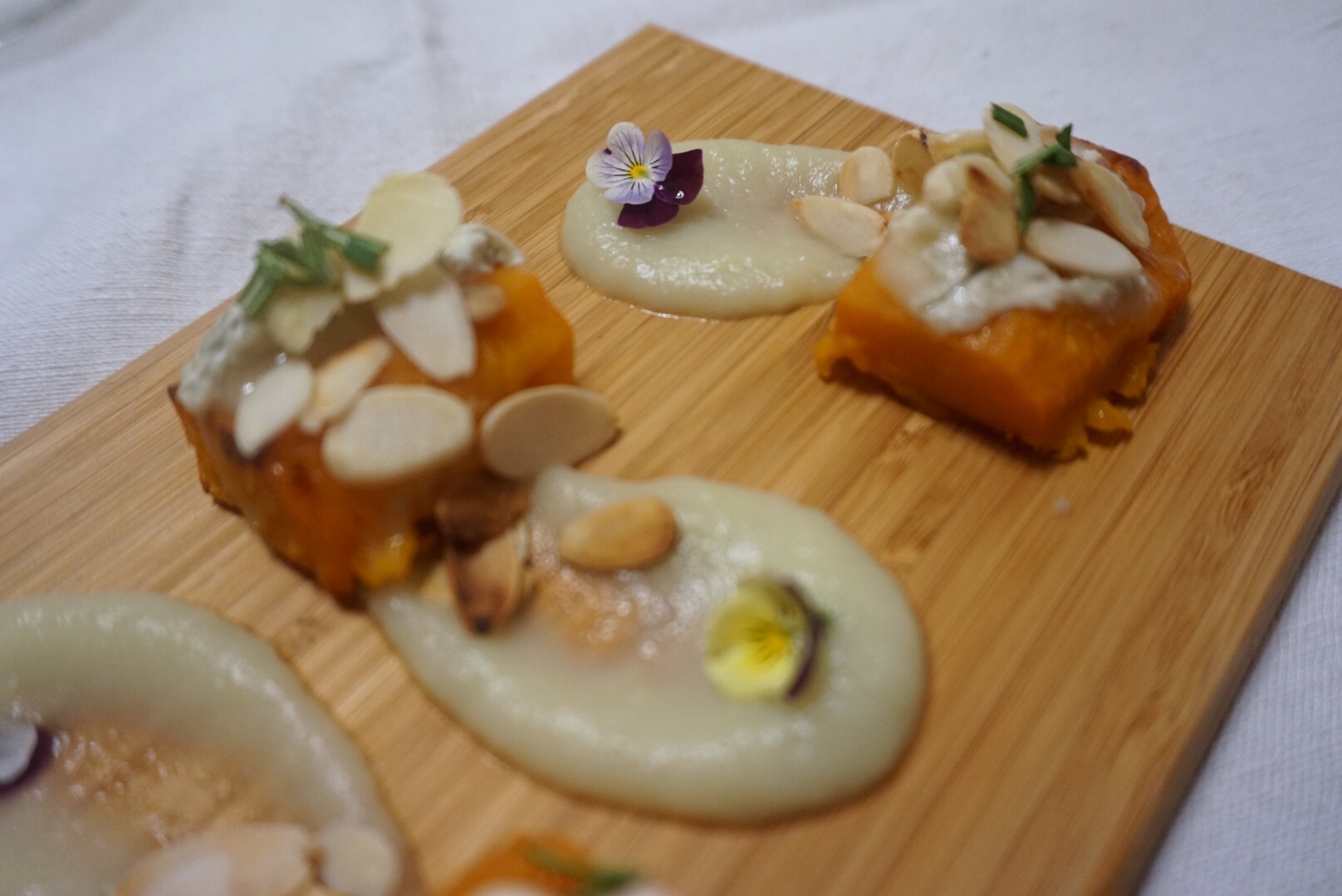 Cubotti di zucca al gorgonzola e mandorle su crema di finocchio e patata