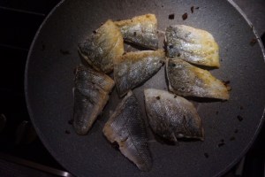 Branzino con brunoise di verdure, capperi e olive taggiasche su crema di finocchio