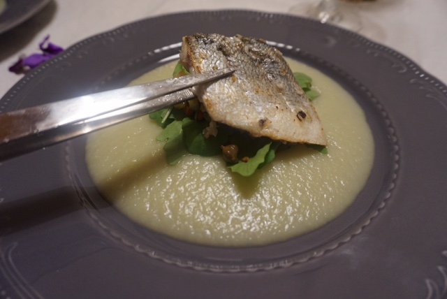 Branzino con brunoise di verdure, capperi e olive taggiasche su crema di finocchio