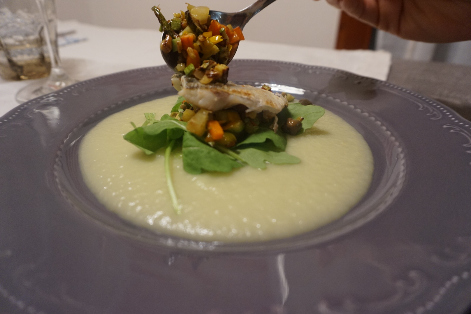 Branzino con brunoise di verdure, capperi e olive taggiasche su crema di finocchio