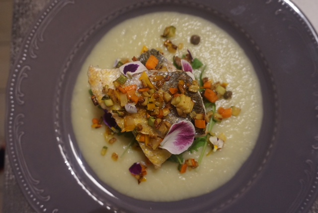 Branzino con brunoise di verdure, capperi e olive taggiasche su crema di finocchio
