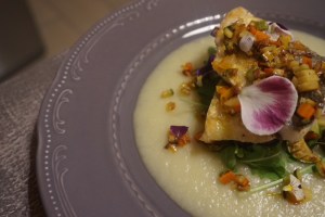 Branzino con brunoise di verdure, capperi e olive taggiasche su crema di finocchio