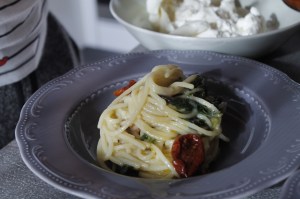 Spaghettone cime di rapa, pomodorini secchi, nocciole e burrata
