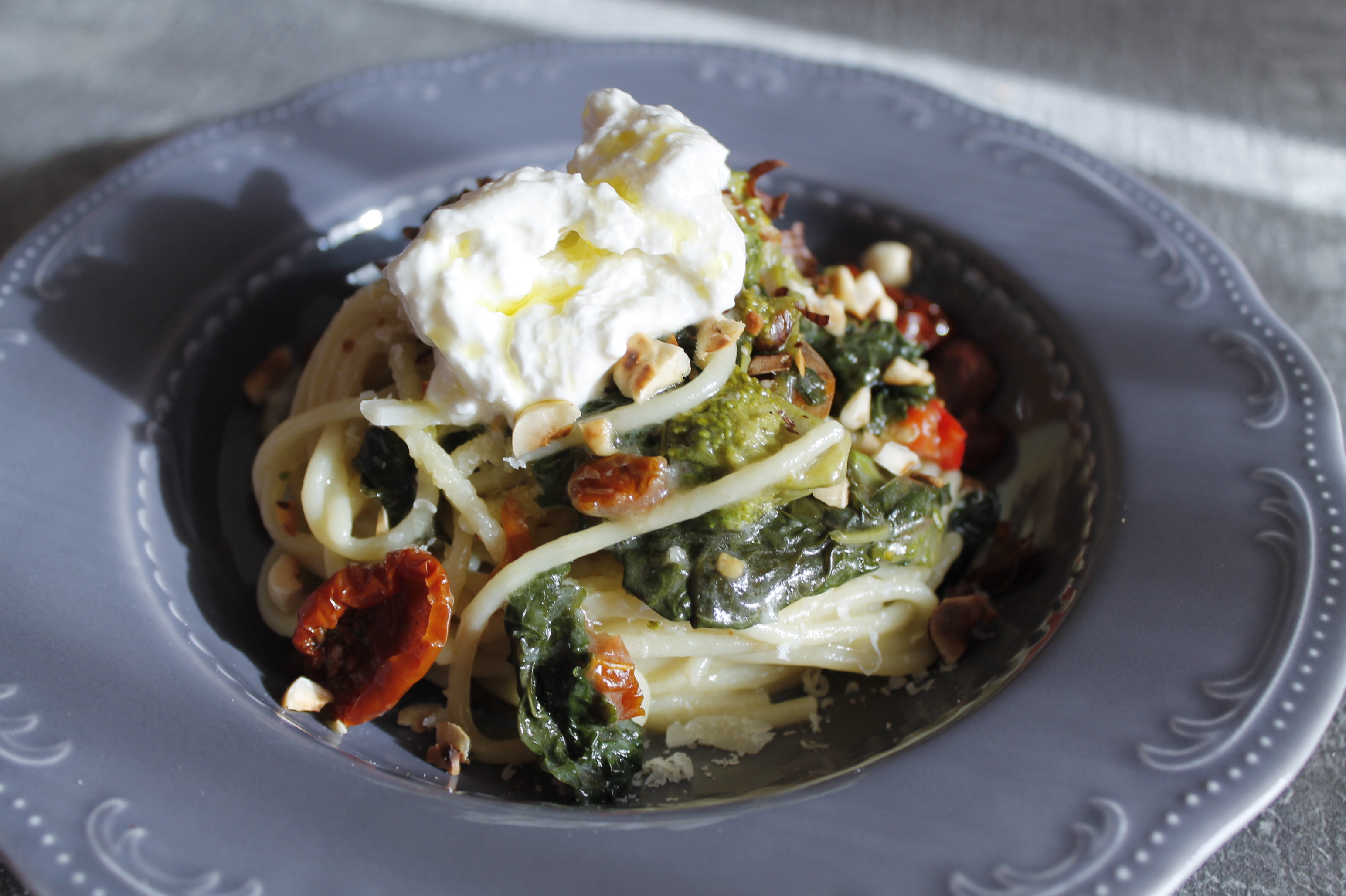Spaghettone cime di rapa, pomodorini secchi, nocciole e burrata