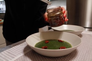 Vellutata di cavolo nero, bietola con prosciutto croccante, pinoli, pomodorini secchi e burratina