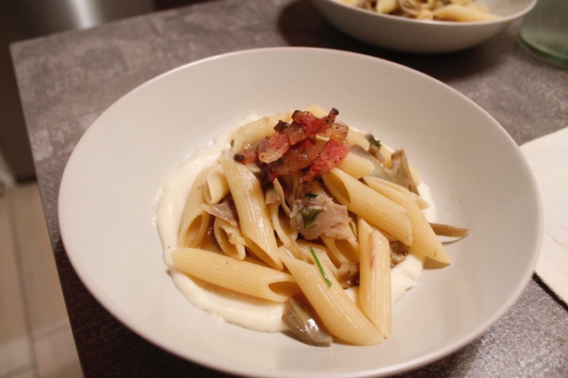 Penne ai carciofi su crema di parmigiano e guanciale croccante