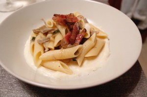 Penne ai carciofi su crema di parmigiano e guanciale croccante