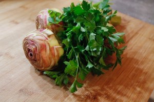 Penne ai carciofi su crema di parmigiano e guanciale croccante