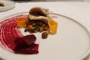 Branzino su dadolata di verdurine croccanti, rapa rossa e aria di capperi