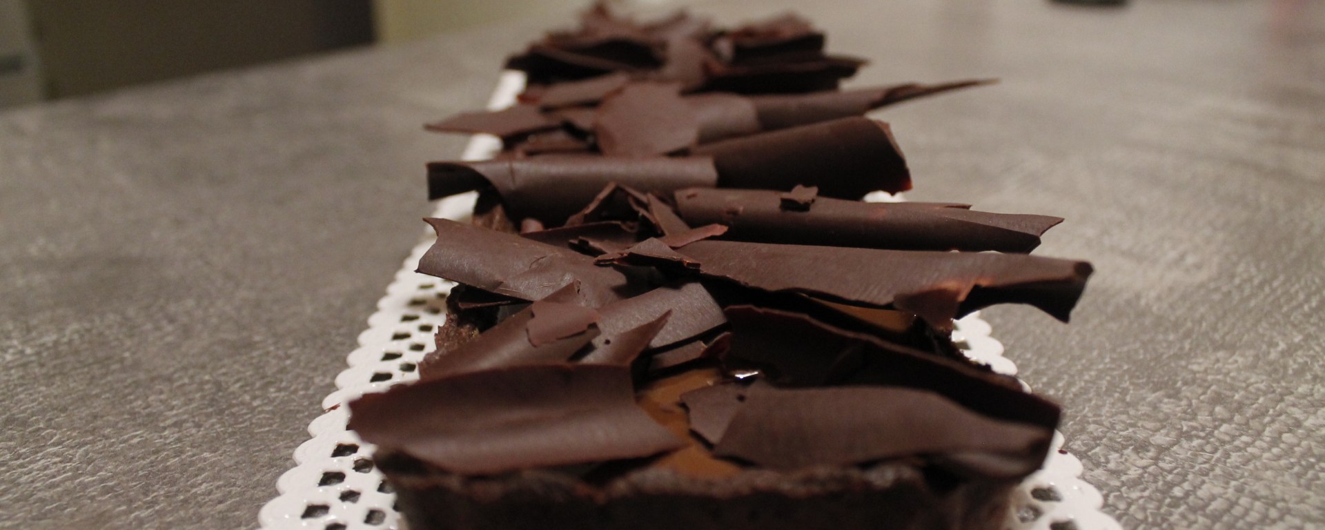 Togliete il cioccolato dal frigo, schiacciate il cilindro di carta da forno per rompere lo strato di cioccolato interno e ricavate le scaglie, togliete anche la crostata dal frigo e guarnitela con le scaglie di cioccolato.