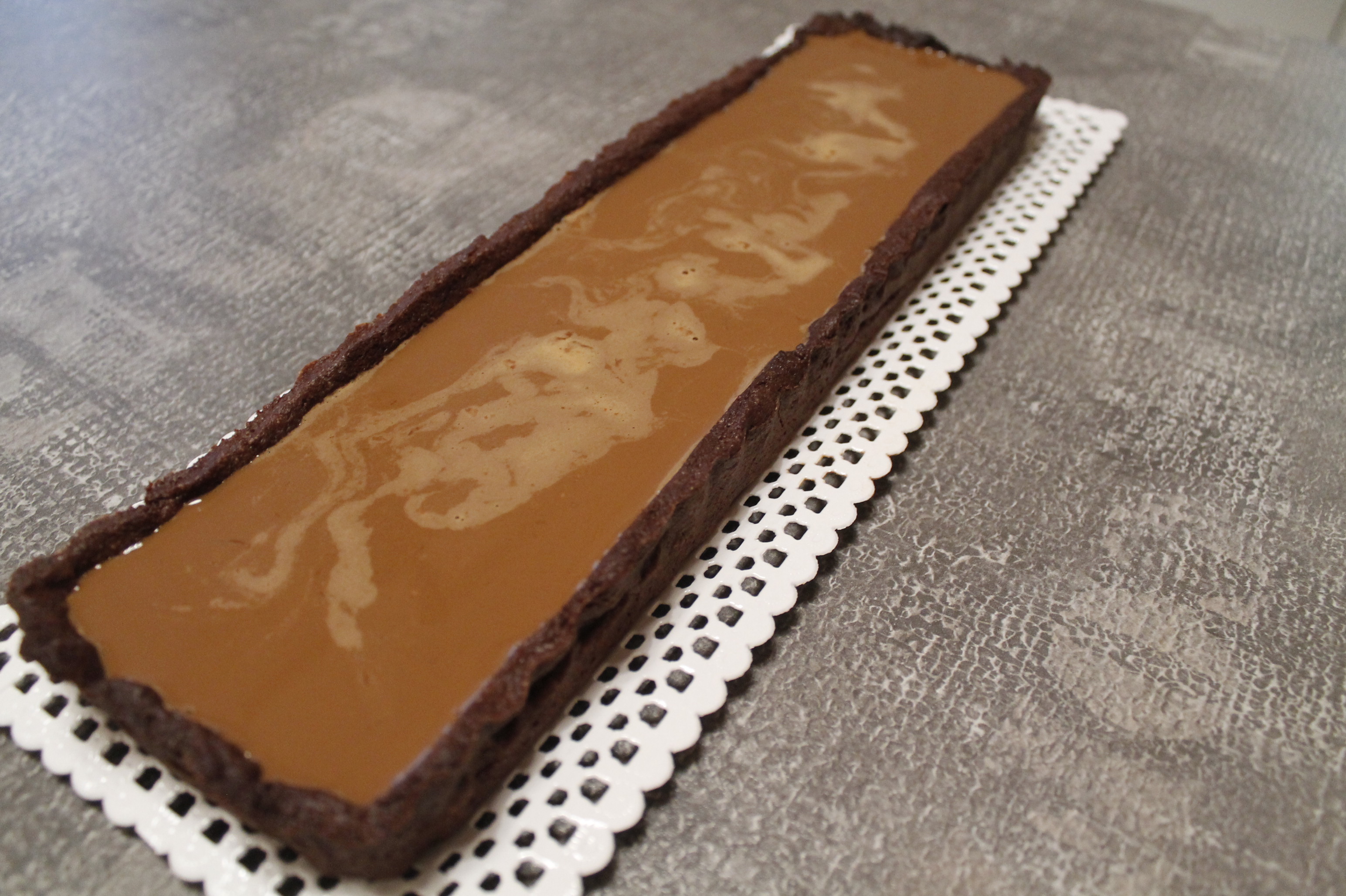 Crostata al cacao con confettura di pere, panna cotta al caffè e scaglie di cioccolato