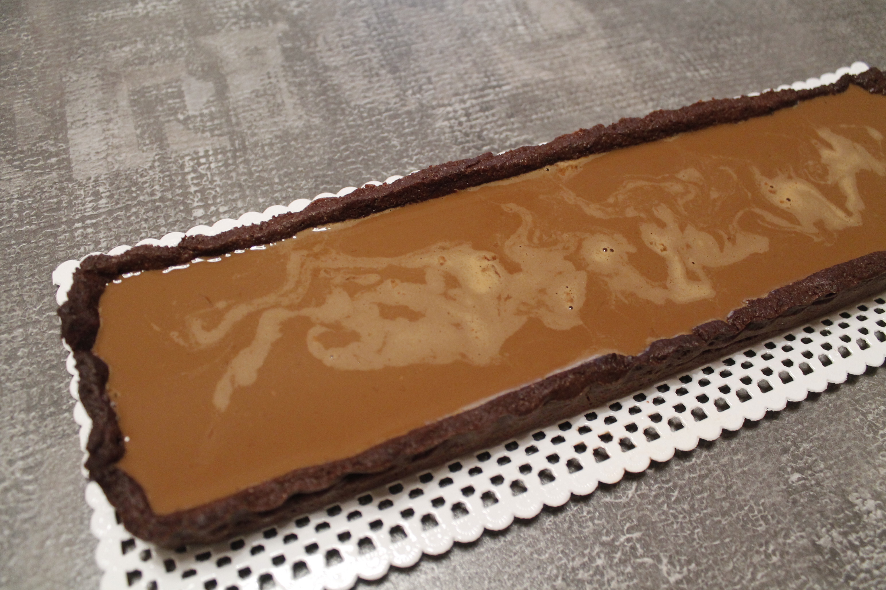 Crostata al cacao con confettura di pere, panna cotta al caffè e scaglie di cioccolato