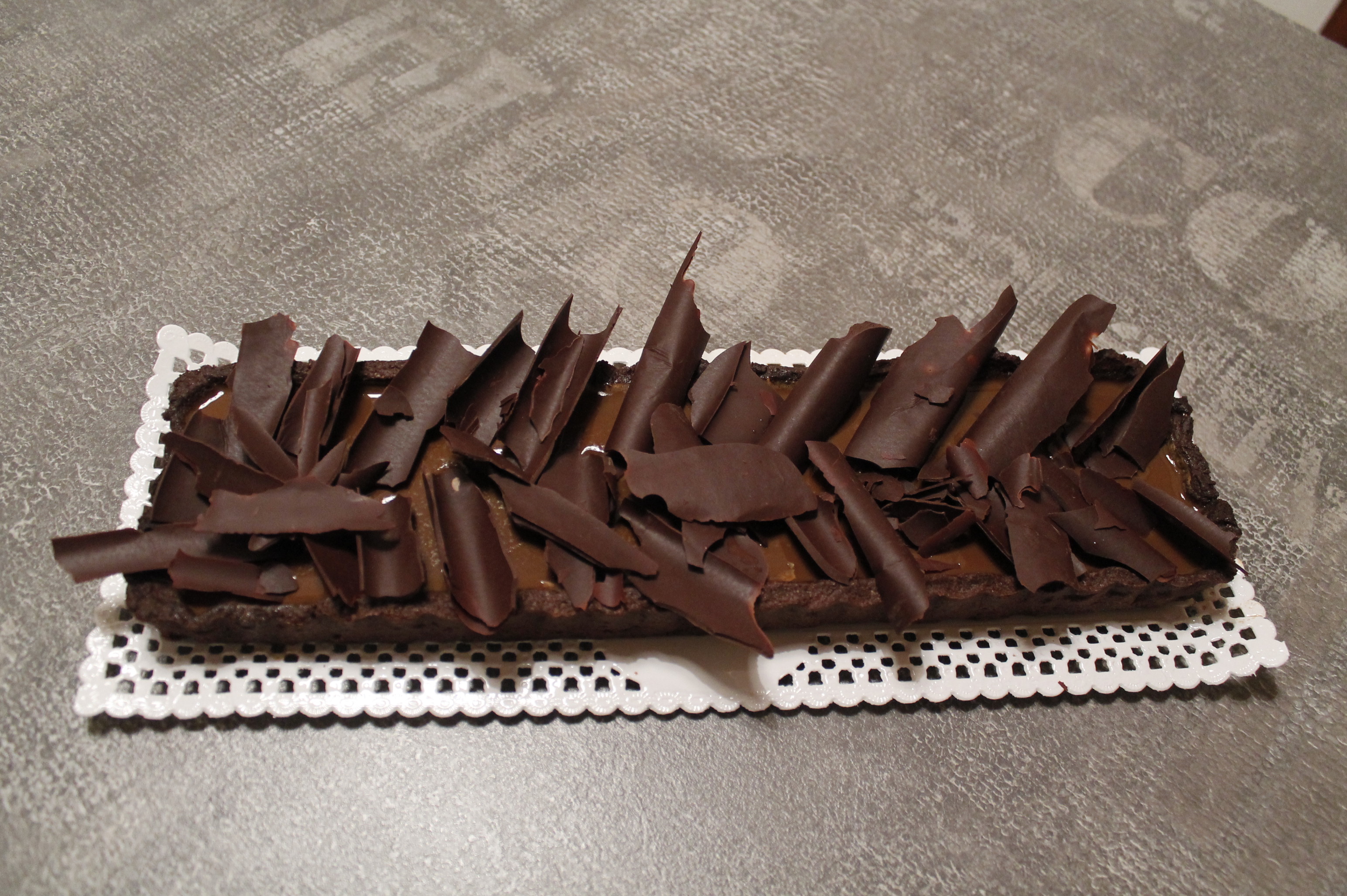 Crostata al cacao con confettura di pere, panna cotta al caffè e scaglie di cioccolato
