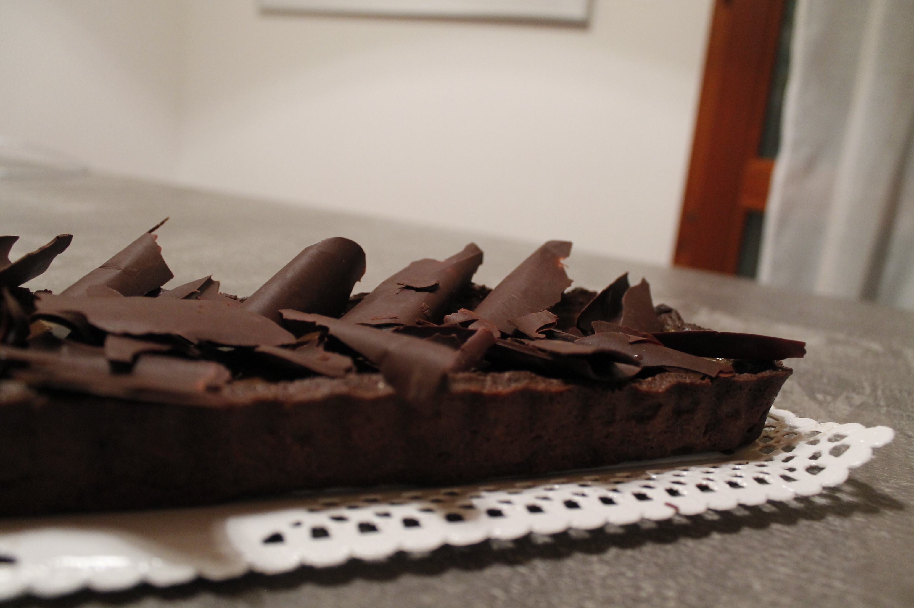 Crostata al cacao con confettura di pere, panna cotta al caffè e scaglie di cioccolato