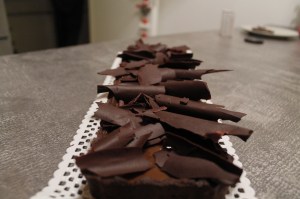 Crostata al cacao con confettura di pere, panna cotta al caffè e scaglie di cioccolato
