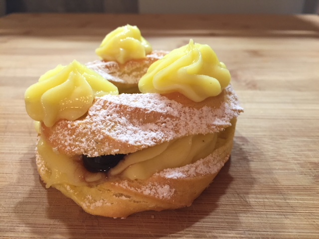 Tagliate a metà le zeppole e farcitele con 100 gr di crema pasticciera all’interno, posizionate l’altra metà della zeppola e decorate con altri 50 gr di crema al centro, un bel ciuffetto.