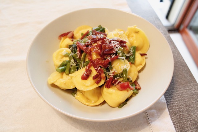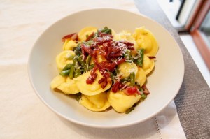 Ravioli di ricotta, asparagi, porro e prosciutto crudo croccante