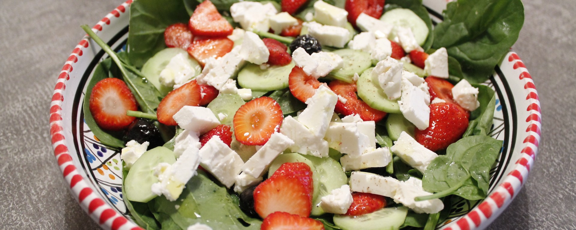 Lavate accuratamente gli spinacini e le fragole, asciugateli e mettete in un’ampia ciotola gli spinaci. Tagliate a fettine sottili fragole e cetriolo e uniteli agli spinaci.