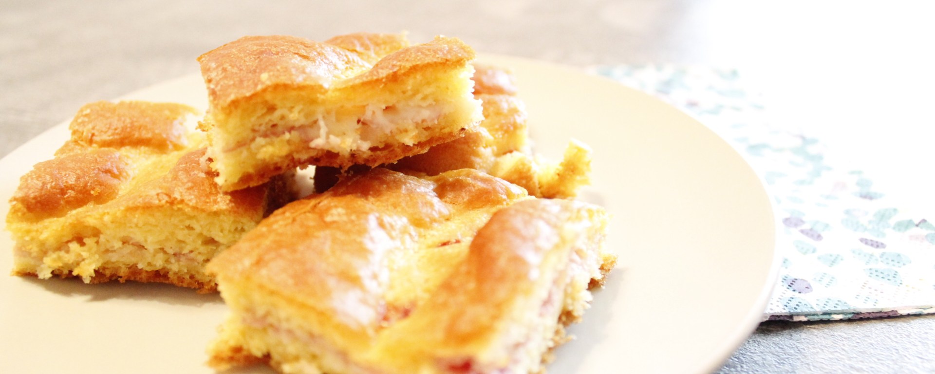 Otterrete un impasto molto morbido, tipo una pastella. Versate metà dell’impasto in una teglia rettangolare non troppo grande e rivestita da carta da forno (se preferite, invece della carta da forno potete ungere la teglia con olio o burro), livellate con il dorso di un cucchiaio e fate uno strato di prosciutto cotto e pezzetti di formaggio. Ricoprite con la pastella rimanente e livellate.