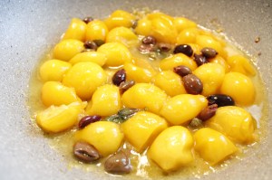 Mezzi rigatoni al sugo di pomodorini gialli, taggiasche e mozzarella di bufala