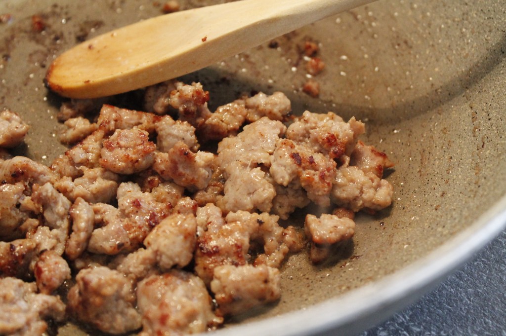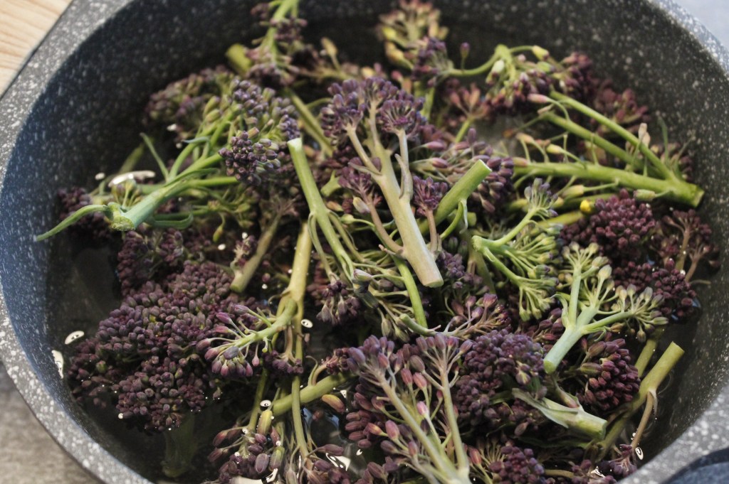 Lavate accuratamente i broccoletti viola e portate ad ebollizione in una pentola di acqua salata, cuocete per qualche minuto. Nel frattempo sbriciolate la salsiccia e fatela rosolare bene in una padella.