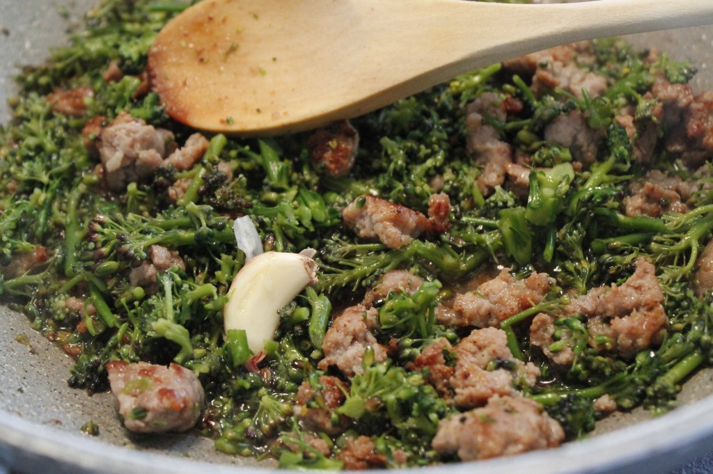Scolate con una ramina i broccoletti e tritateli al coltello, aggiungeteli poi alla salsiccia con un filo d’olio EVO e uno spicchio d’aglio in camicia. Se lo gradite aggiungete del peperoncino. Versate un mestolo di acqua di cottura e fate cuocere un paio di minuti a fuoco alto.