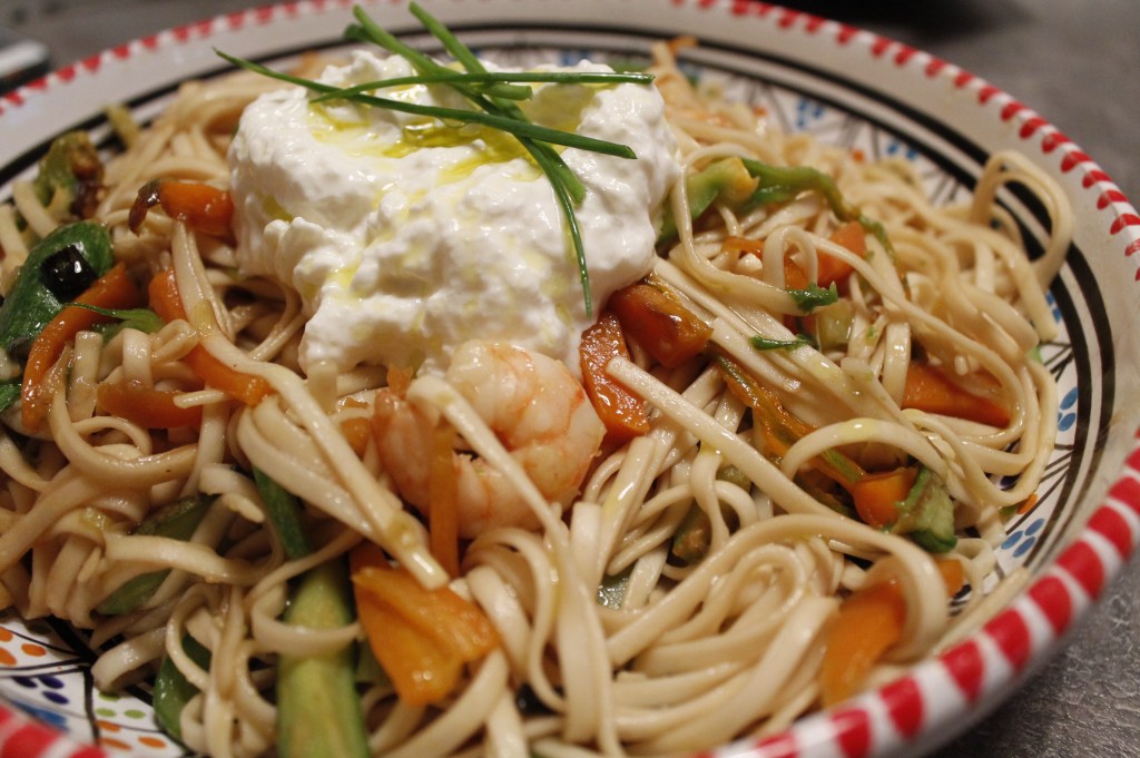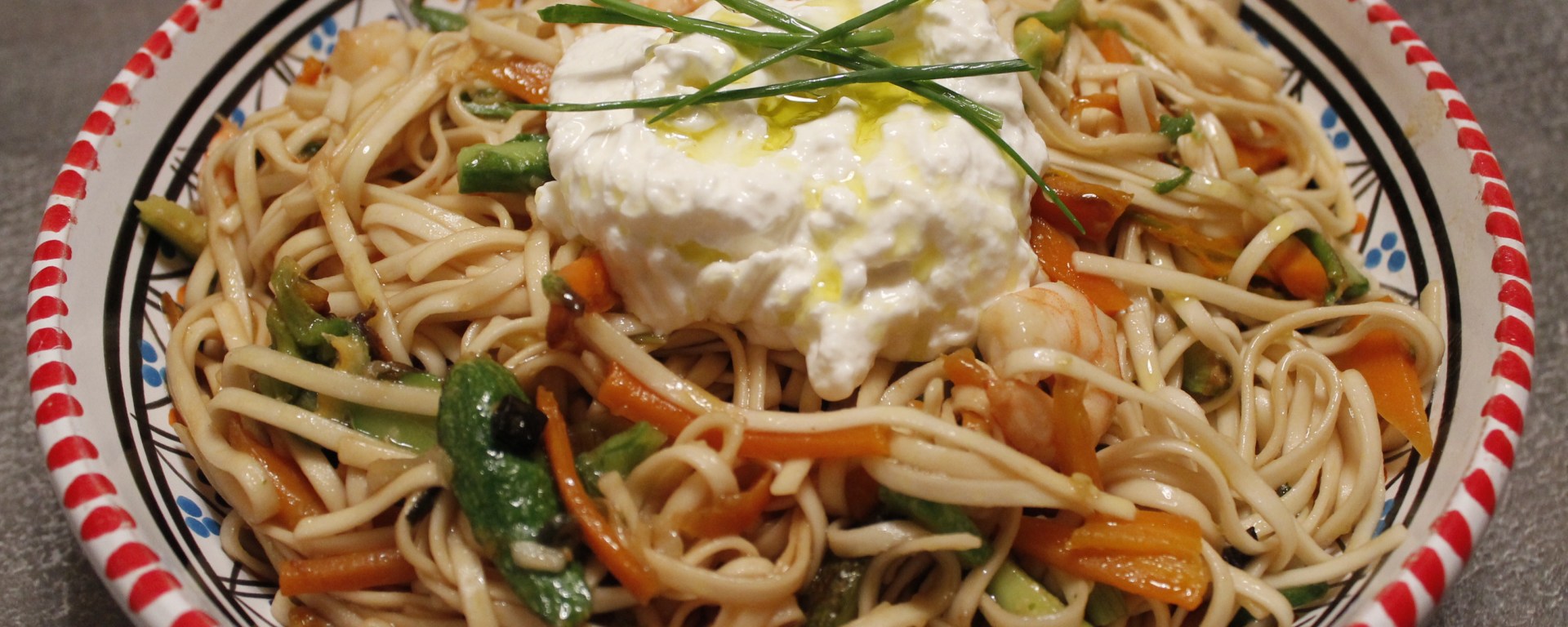 I ristoranti sono chiusi, abito fuori città, i delivery di ristoranti cinesi e giapponesi non arrivano fin qui, e io morivo dalla voglia di mangiare un piatto etnico, ho preparato questi noodles con verdurine croccanti e gamberi. Come tocco finale la cremosità della stracciatella, una rivisitazione che dà al piatto un tocco in più.