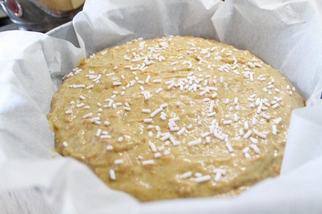 Sbattete le uova con lo zucchero di canna fino a quando diventeranno belle spumose. Aggiungete le carote che avrete precedentemente grattugiato finemente e mescolate. Unite il succo e la scorza di un’arancia, l’olio di semi e il lievito. Mescolate e per ultimo aggiungete la farina. Quando il composto sarà ben amalgamato trasferite un una teglia da forno ricoperta con carta da forno. Prima di infornare la torta, l’ho cosparsa con dei granellini di zucchero.