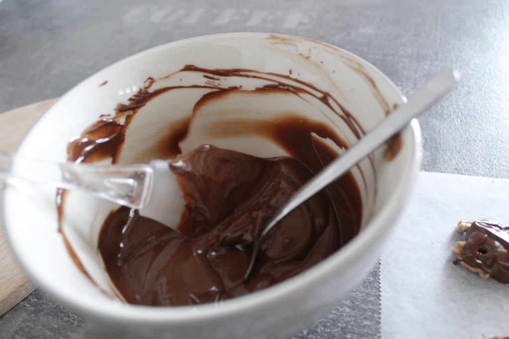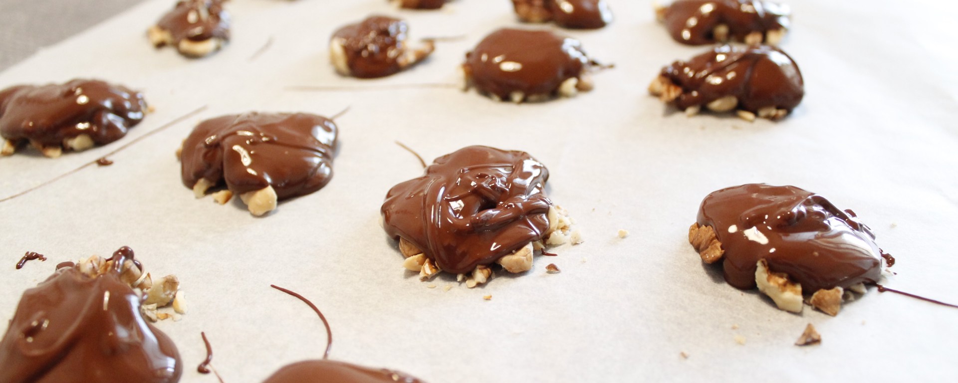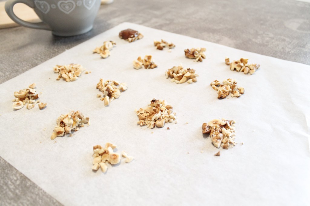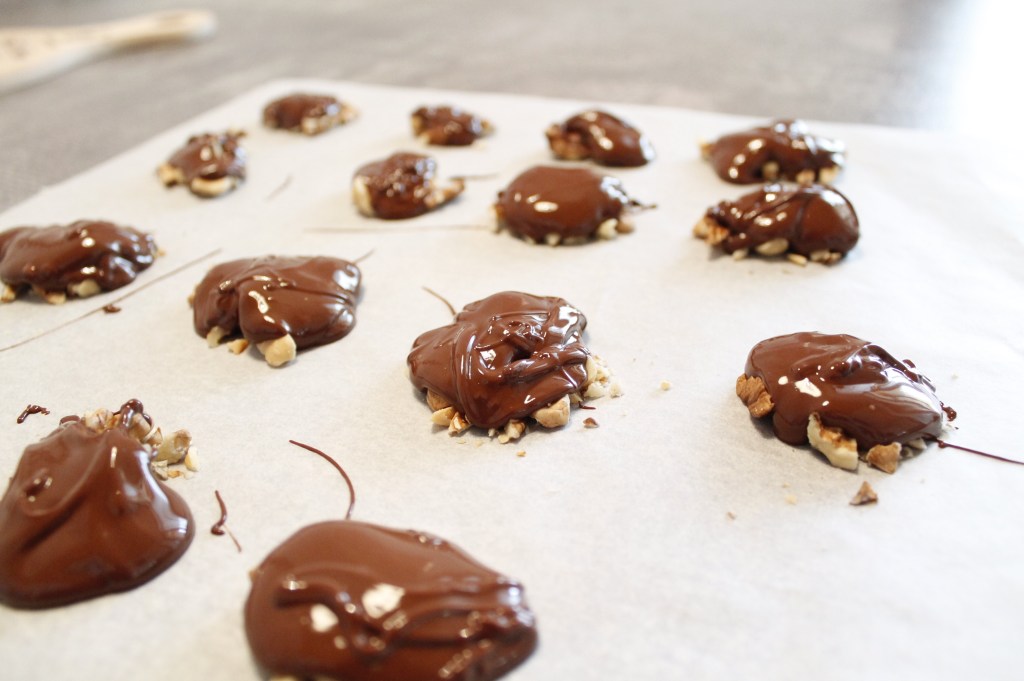Sciogliete al microonde per qualche secondo i pezzetti di cioccolato oppure con il classico metodo a bagno maria. Nel frattempo tritate la frutta secca che avrete precedentemente tostato in forno per 10 minuti e disponetela a mucchietti su carta forno. Versate sopra ad ogni mucchietto con un cucchiaino il cioccolato fuso. Lasciate raffreddare ed ecco fatto!