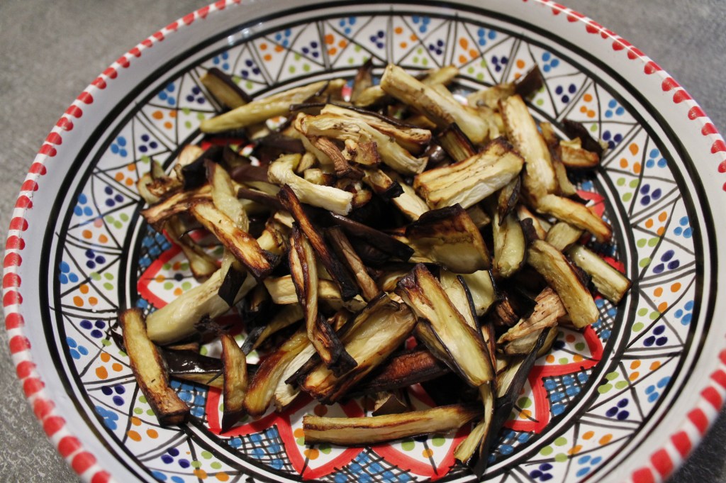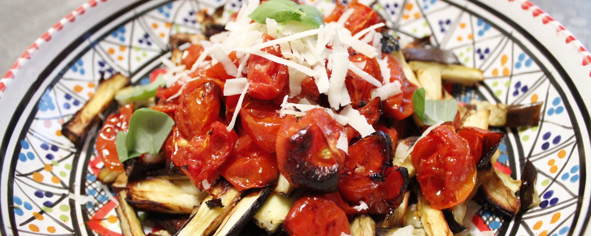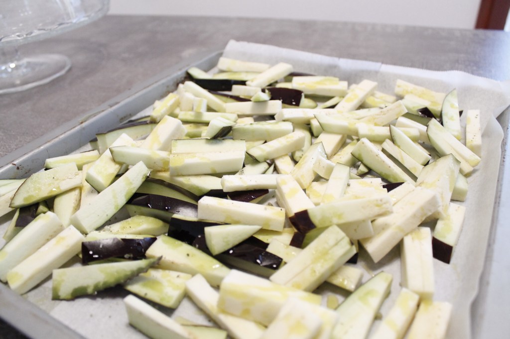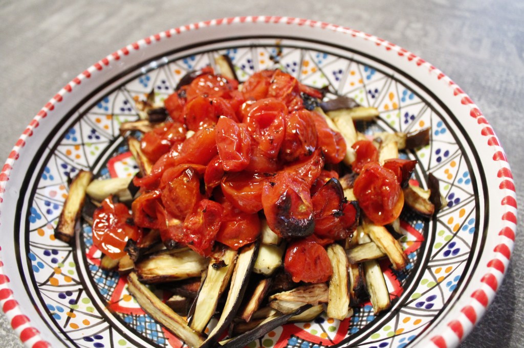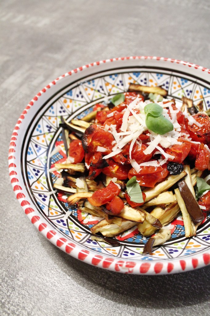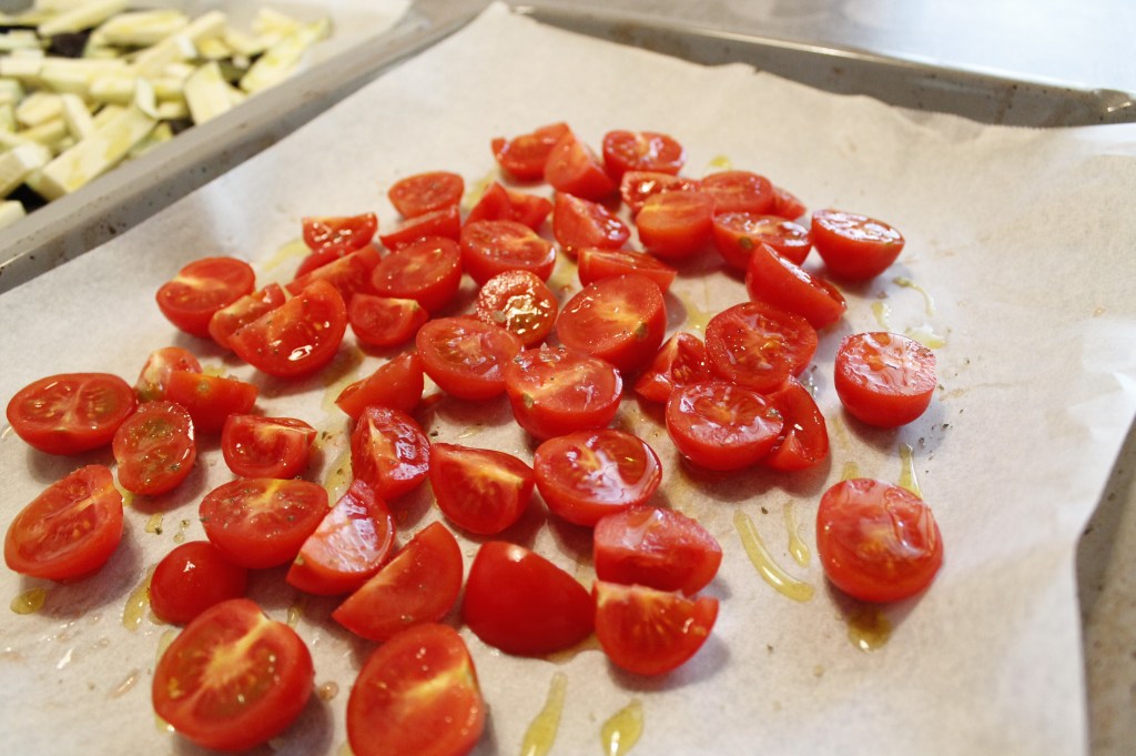 Tagliate a fiammiferi dello spessore di 1 centimetro circa le melanzane e disponetele su una teglia rivestita di carta da forno, tagliate a metà anche i pomodorini e disponeteli su una teglia come per le melanzane. Condite entrambe le teglie con olio EVO e sale. Infornate a 180° per circa 20 minuti, le verdure dovranno essere ben cotte e caramellate.