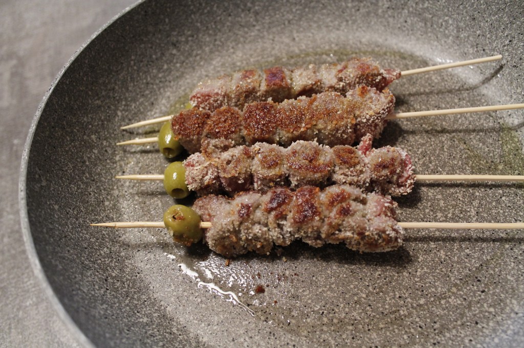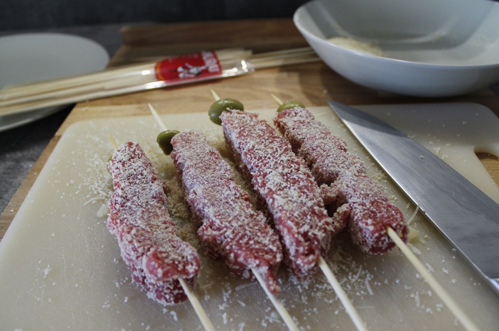 Arrotolate le fettine di carne di manzo e tagliatele dei pezzetti da circa 3 cm l’uno. Infilate i pezzetti nello spiedino di legno, potete decidere se alternare ad ogni pezzo di carne un’oliva o se metterne solamente una all’estremità.