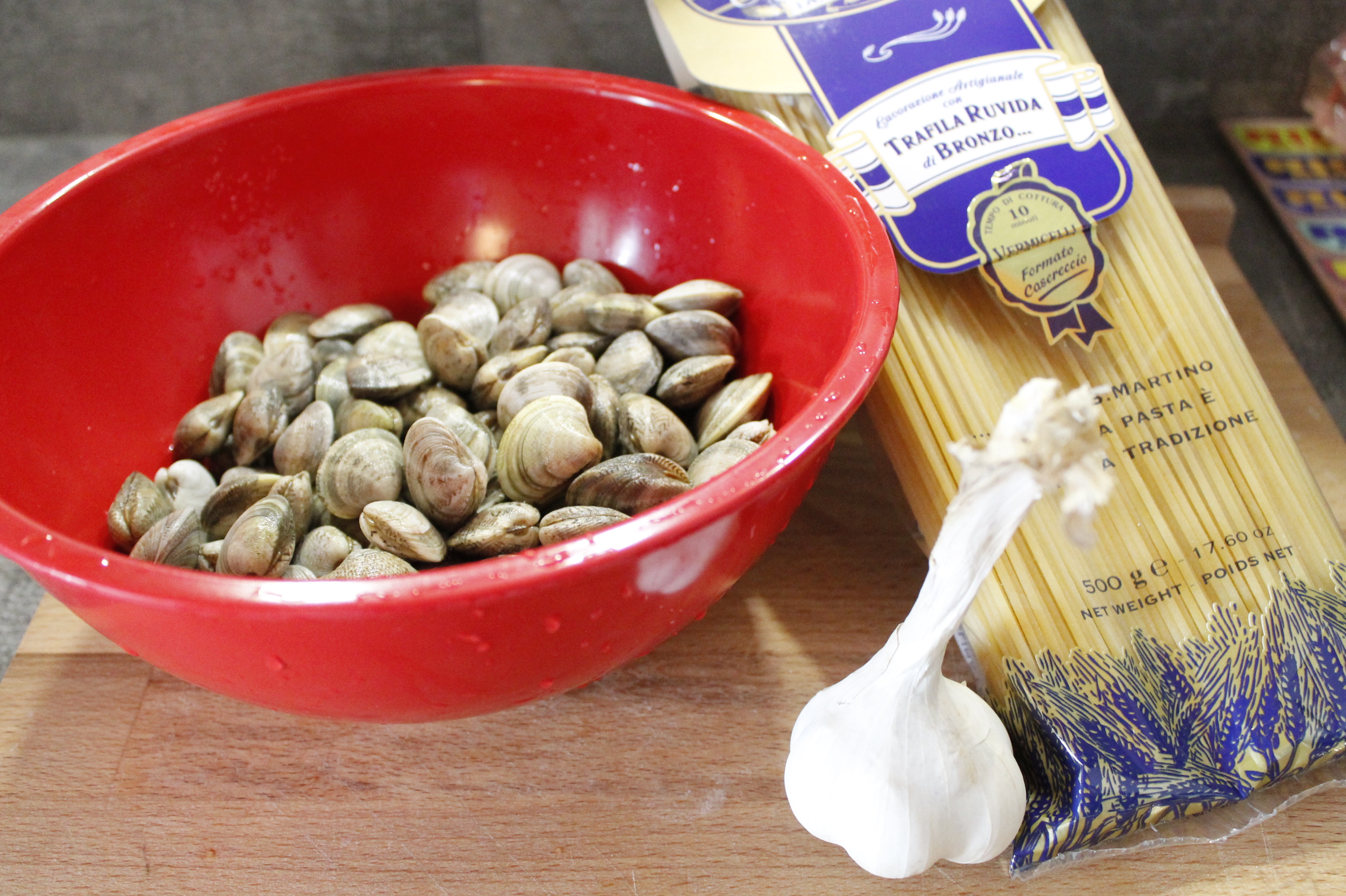 Per prima cosa lavate accuratamente le vongole e lasciatele a bagno con acqua e sale grosso per almeno mezz’ora. Cercate di sciacquarle bene rimuovendo più sabbia possibile.