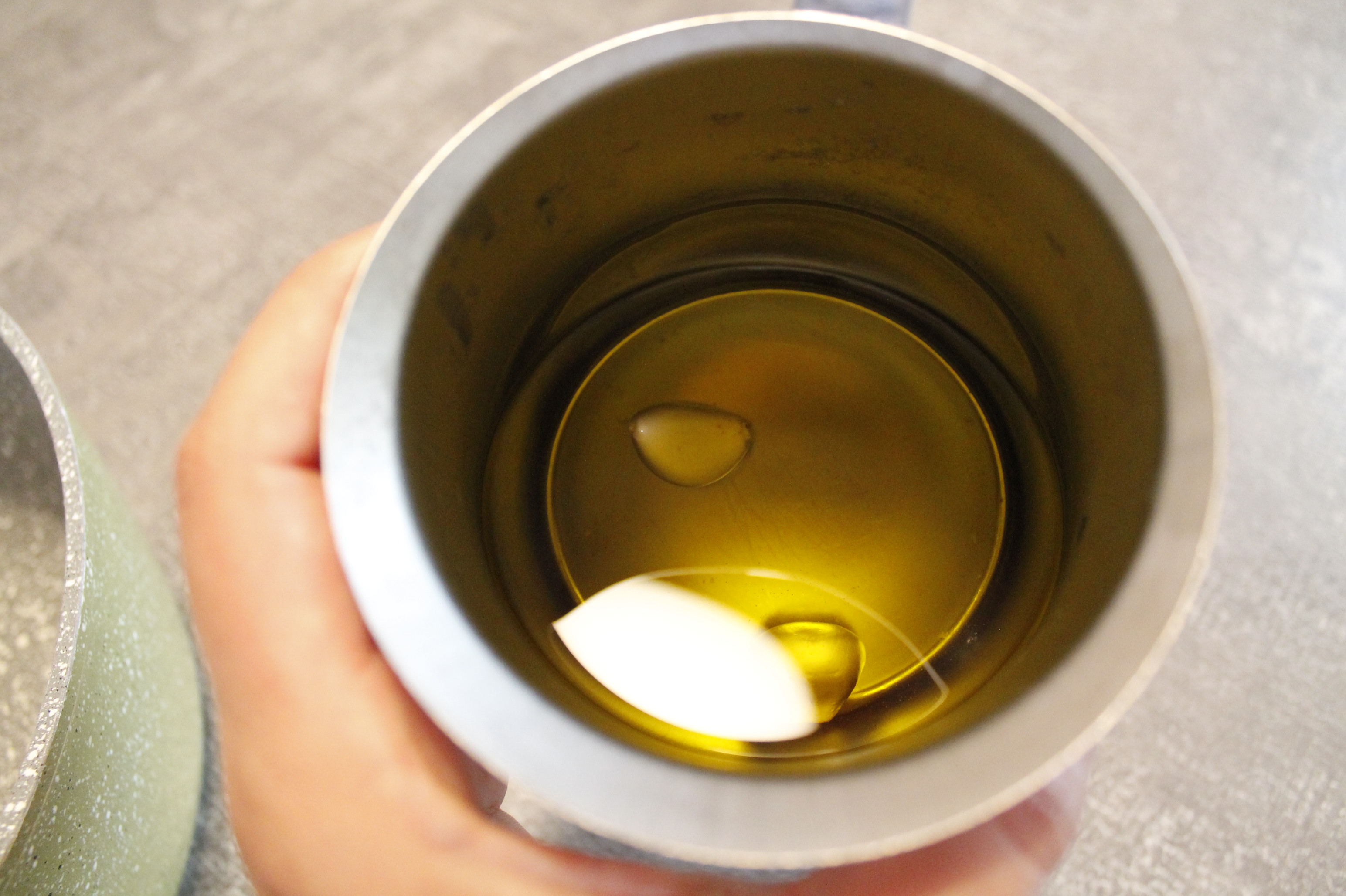 Nel frattempo portate ad ebollizione l’acqua per gli spaghetti e mettete i due spicchi d’aglio in un pentolino stretto ed alto insieme all’olio. Mettetelo sul fuoco a fiamma bassissima, se inizia a fare le bolle toglietelo, aspettate che scenda di temperatura e poi rimettetelo di nuovo sulla fiamma, così fino a quando toccandolo con i rebbi della forchetta l’aglio non risulterà morbidissimo.