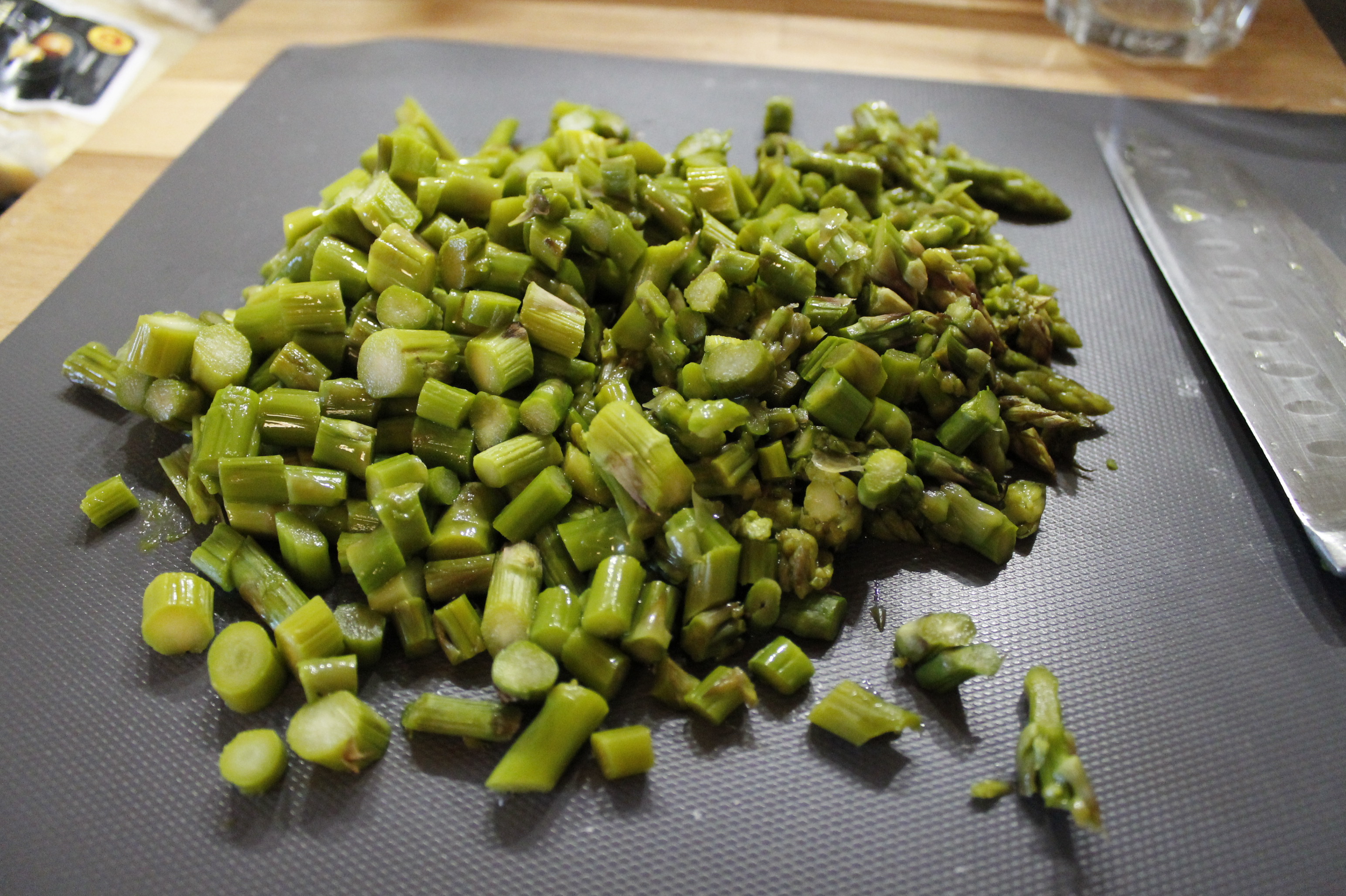 Per prima cosa lavate accuratamente gli asparagi e cuocete solo la parte edibile o al vapore, o nel microonde, oppure se preferite potete bollirli. lasciateli intiepidire e tagliateli a rondelline sottili.
