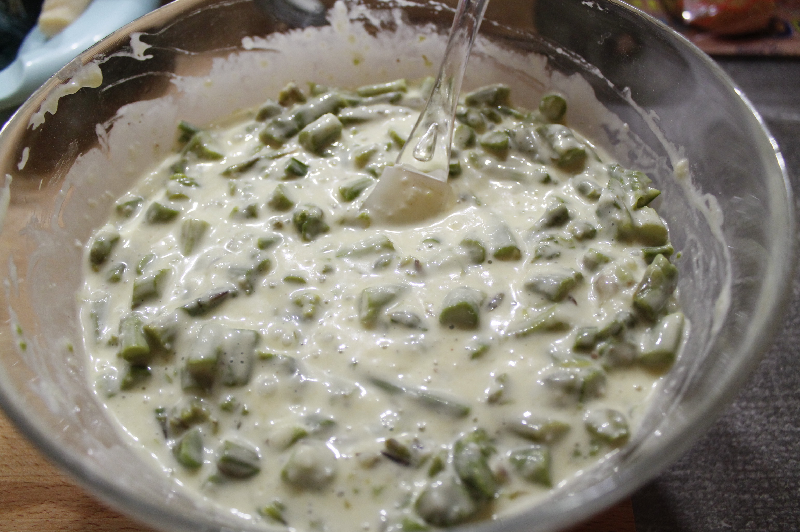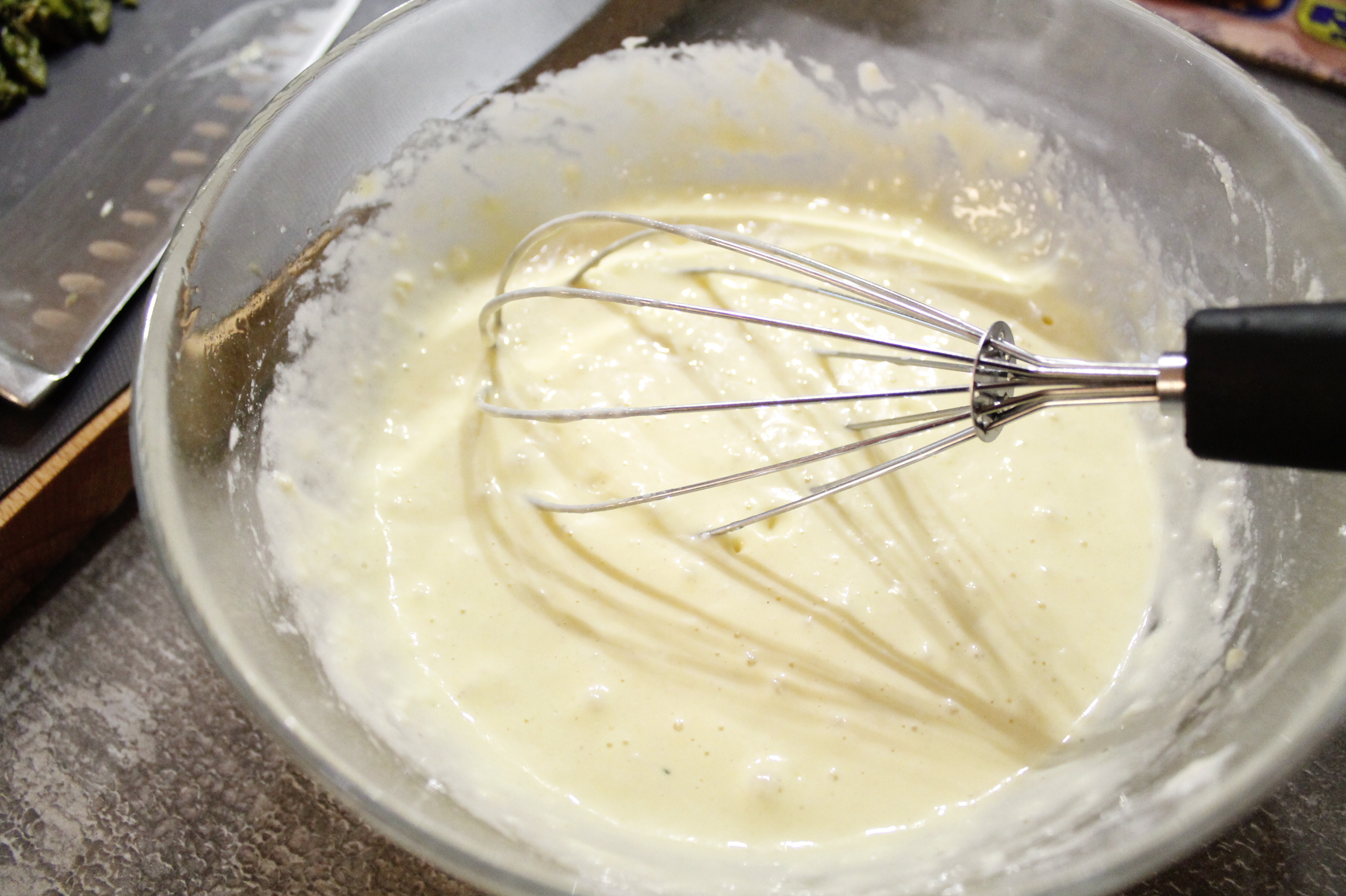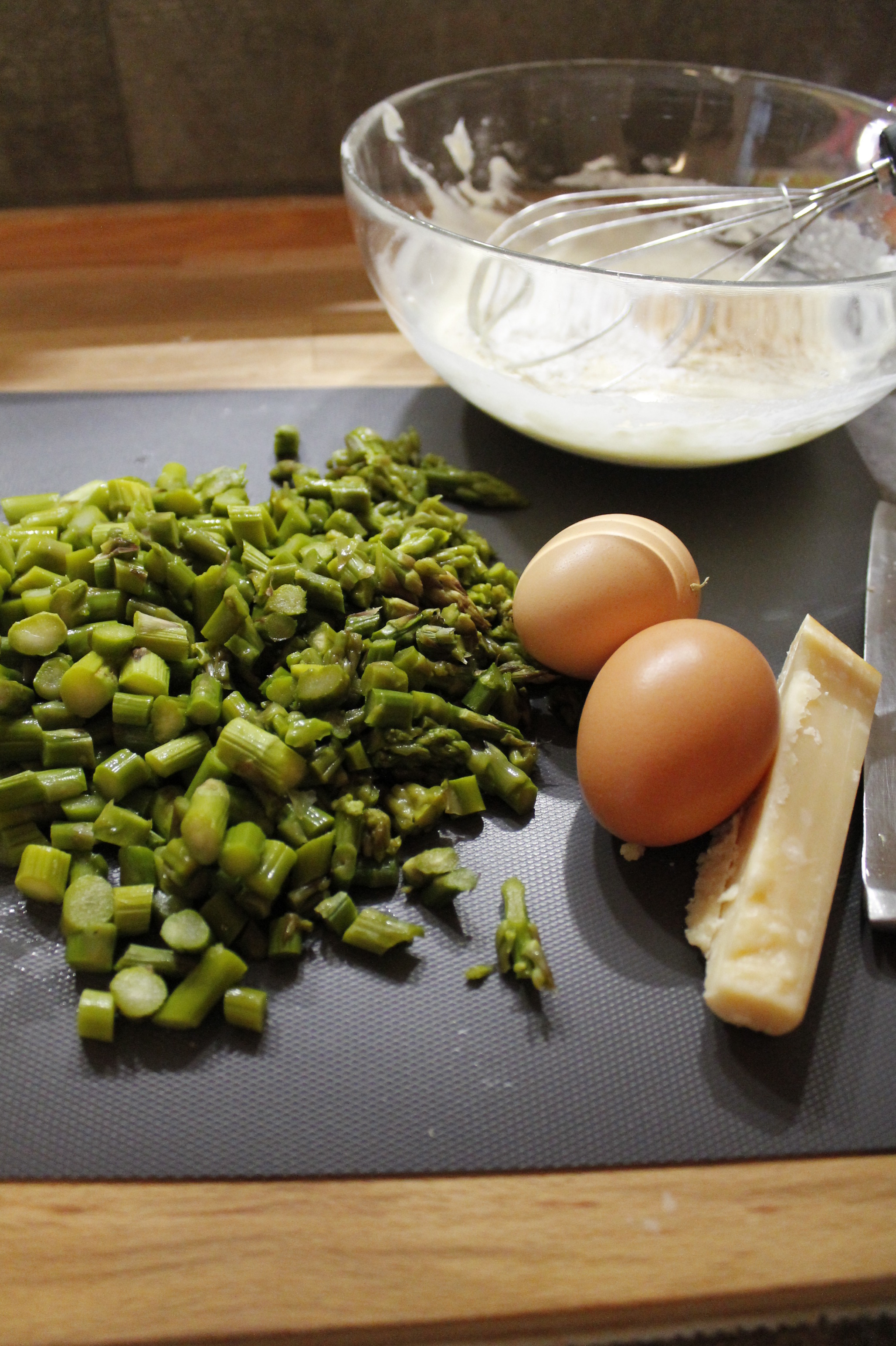 Preparate la pastella in una ciotola capiente, mescolate con la frusta a mano la farina con il latte, deve venire un composto abbastanza duro, a questo punto aggiungete il parmigiano, il lievito e le uova, dovrete ottenere una specie di pastella cremosa, liquida ma non troppo. Condite con sale e abbondante noce moscata e unite gli asparagi.