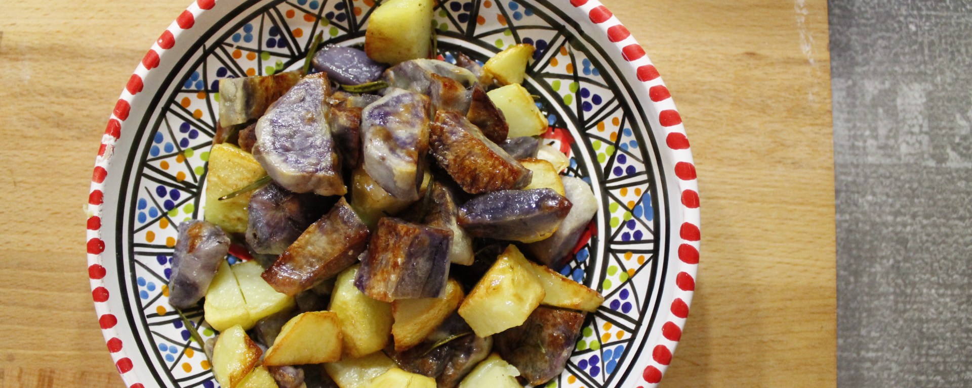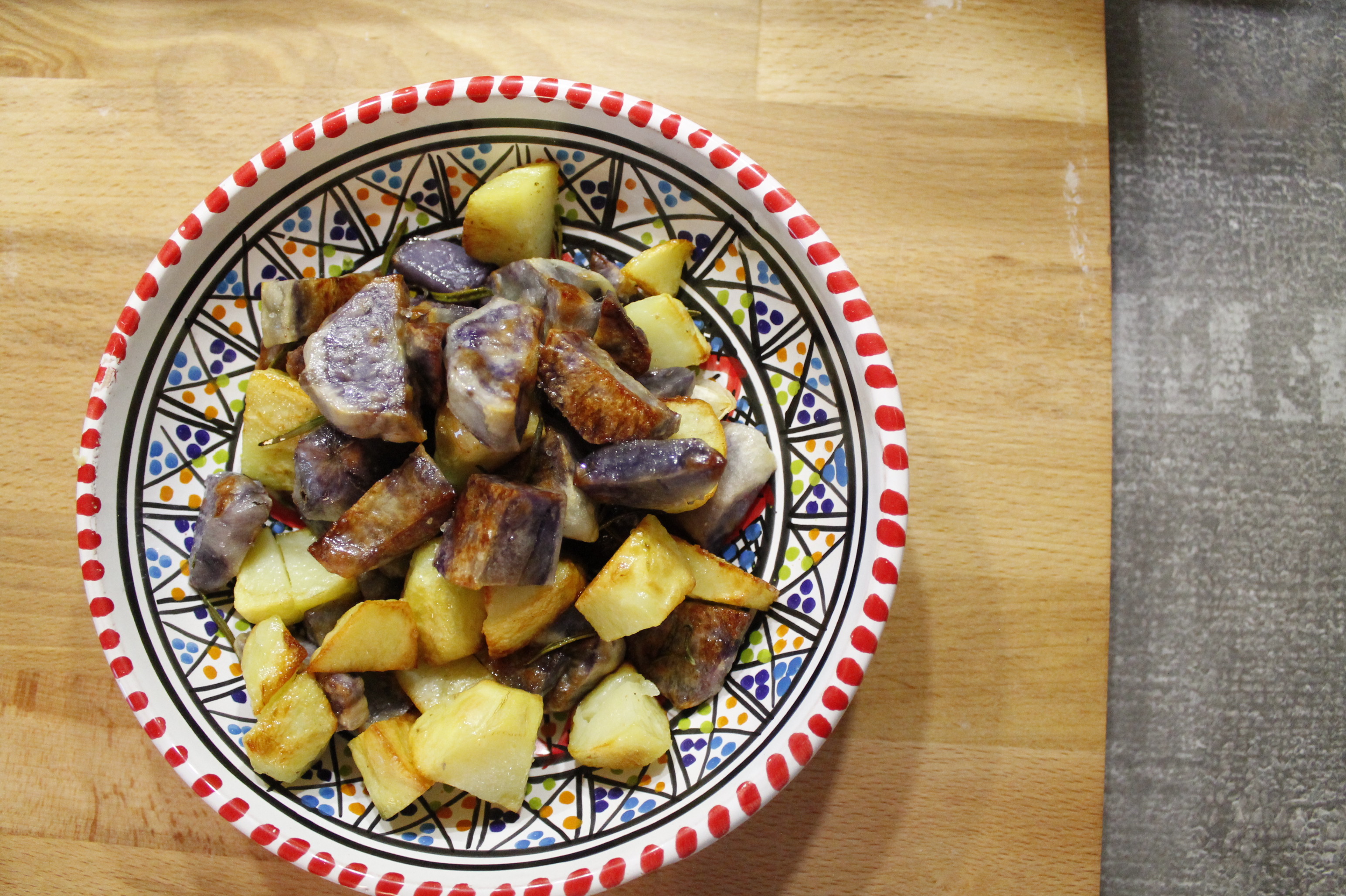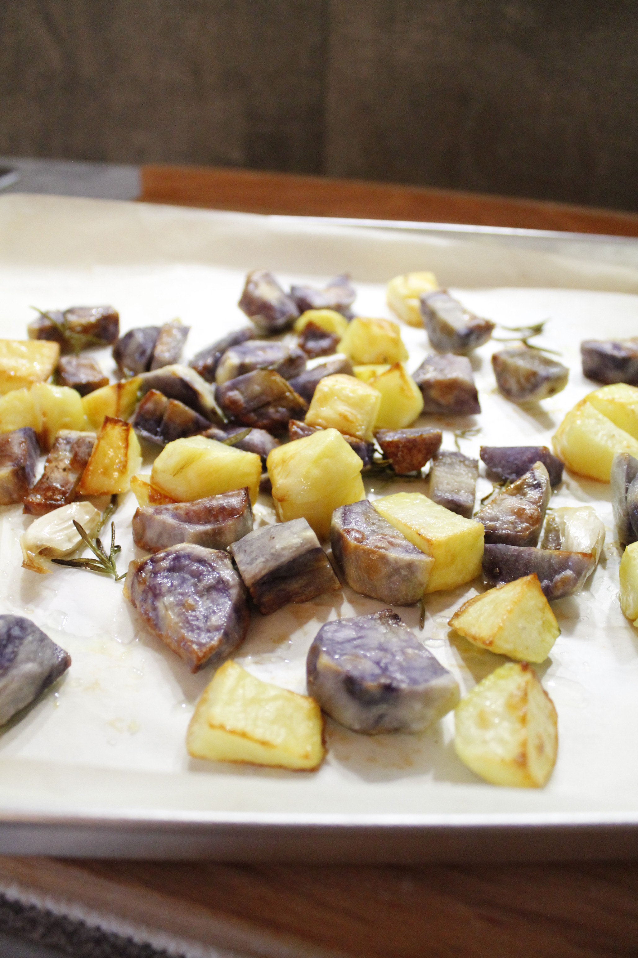 Una volta fredde, disponete le patate su una teglia rivestita di carta forno, sciogliete una noce di strutto e condite le patate prima con sale e pepe poi versate a filo lo strutto e aggiungete qualche filo di rosmarino e l’aglio in camicia.