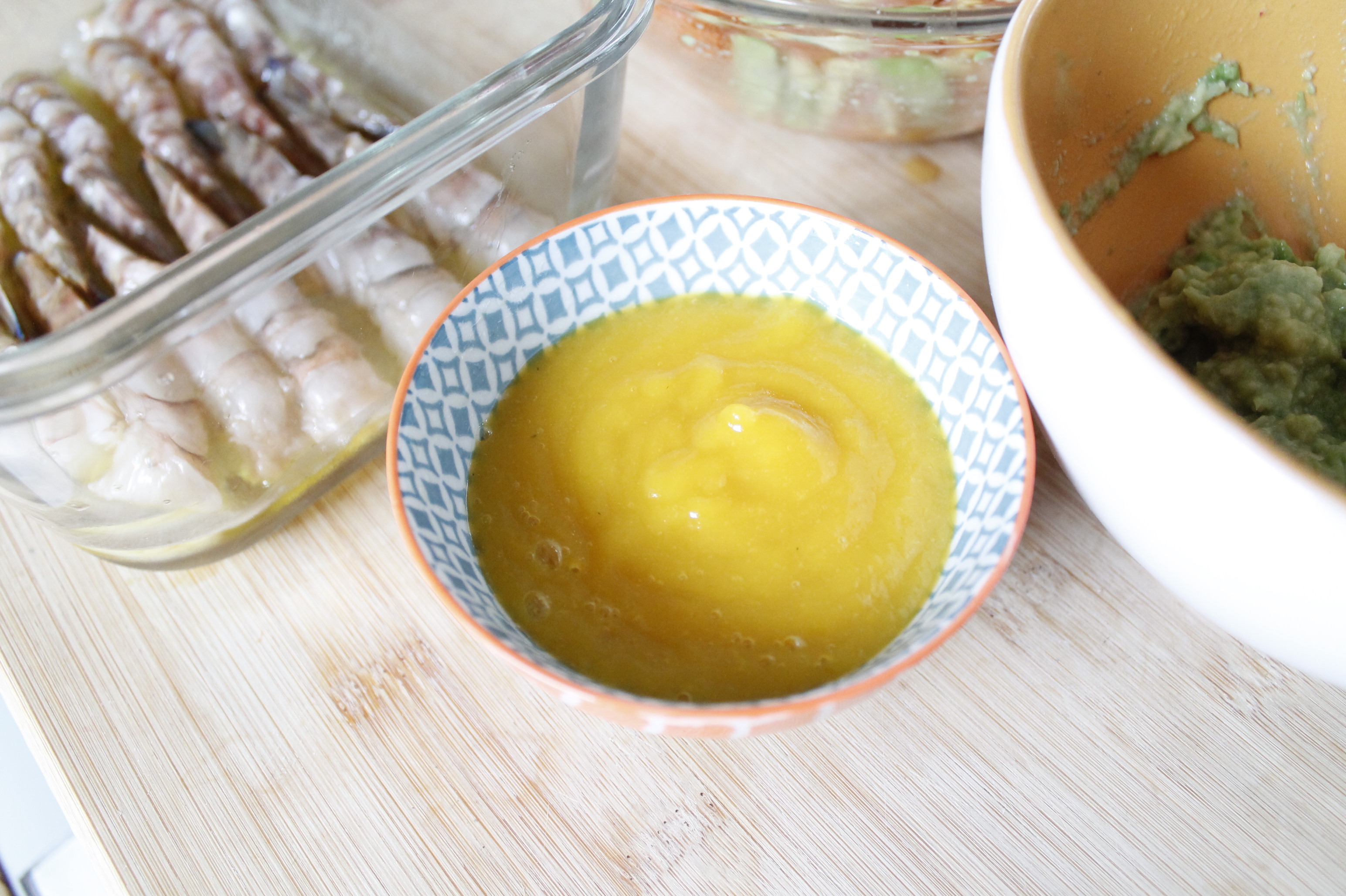 Pulite accuratamente le mazzancolle lasciandogli solo la coda, per fortuna le mie erano già state pulite alla perfezione in pescheria. Fate una citronette mescolando 1/2 limone spremuto con tre cucchiai di olio EVO e versatela sopra le mazzancolle in modo che si marinino per una mezz’ora.