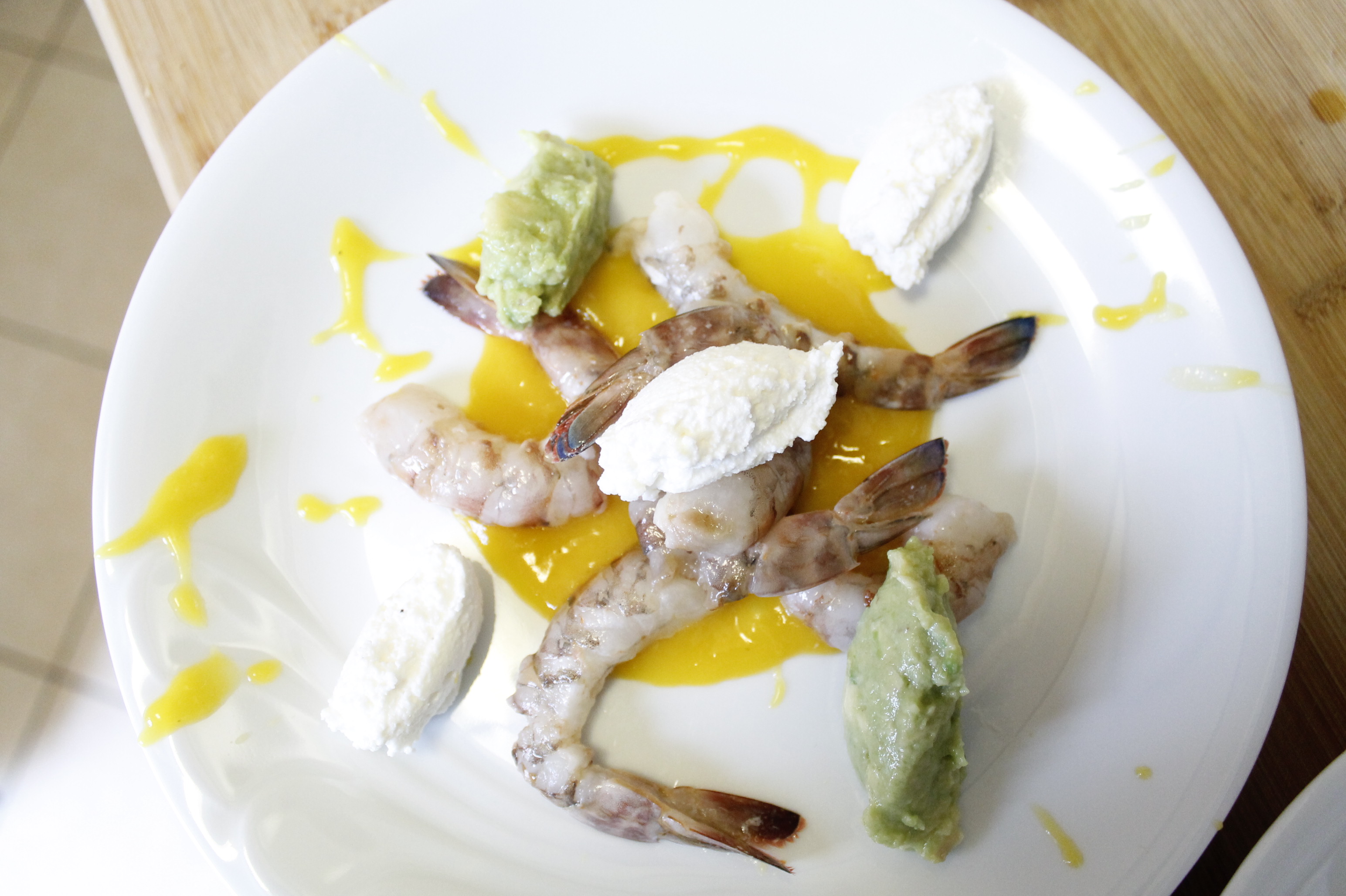 Ora avete tutto pronto e potete impiattare come preferite, io ho fatto una base di salsa al mango, e delle quenelles di ricotta e avocado, posizionando al centro le mazzancolle.