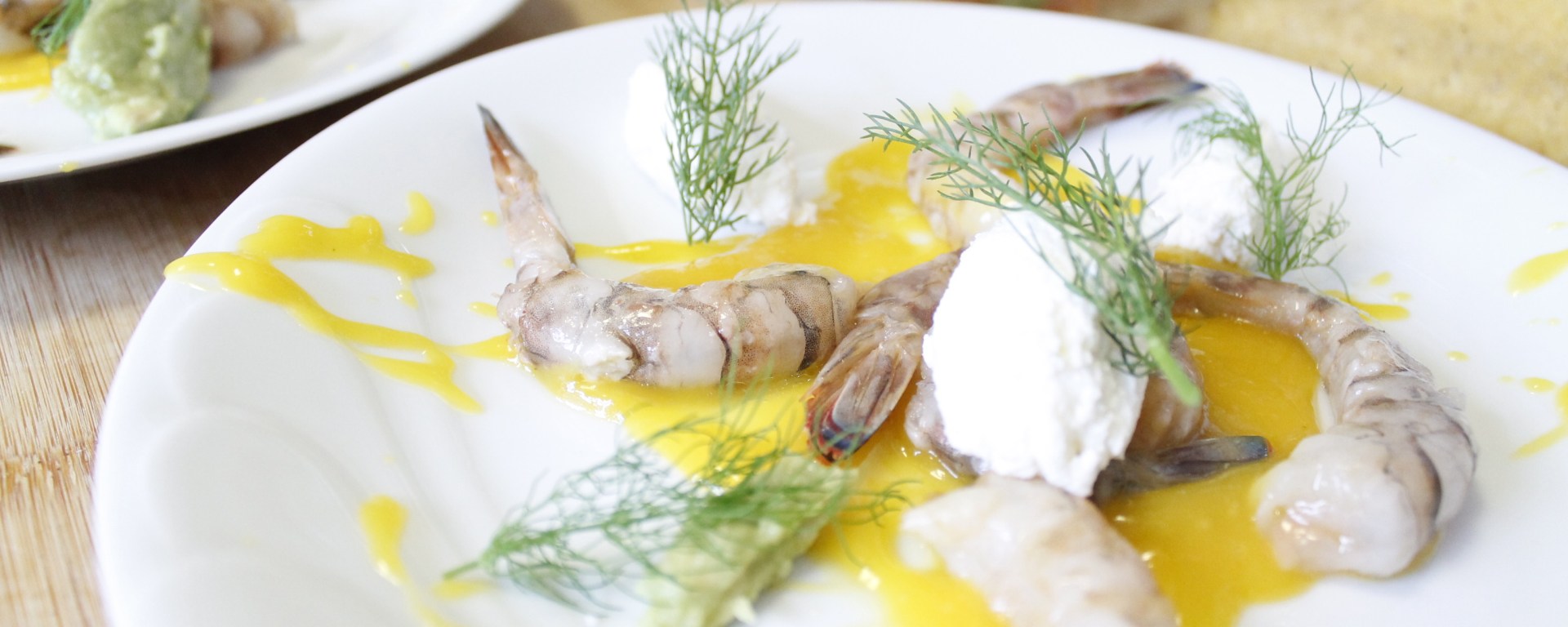 Ora avete tutto pronto e potete impiattare come preferite, io ho fatto una base di salsa al mango, e delle quenelles di ricotta e avocado, posizionando al centro le mazzancolle.